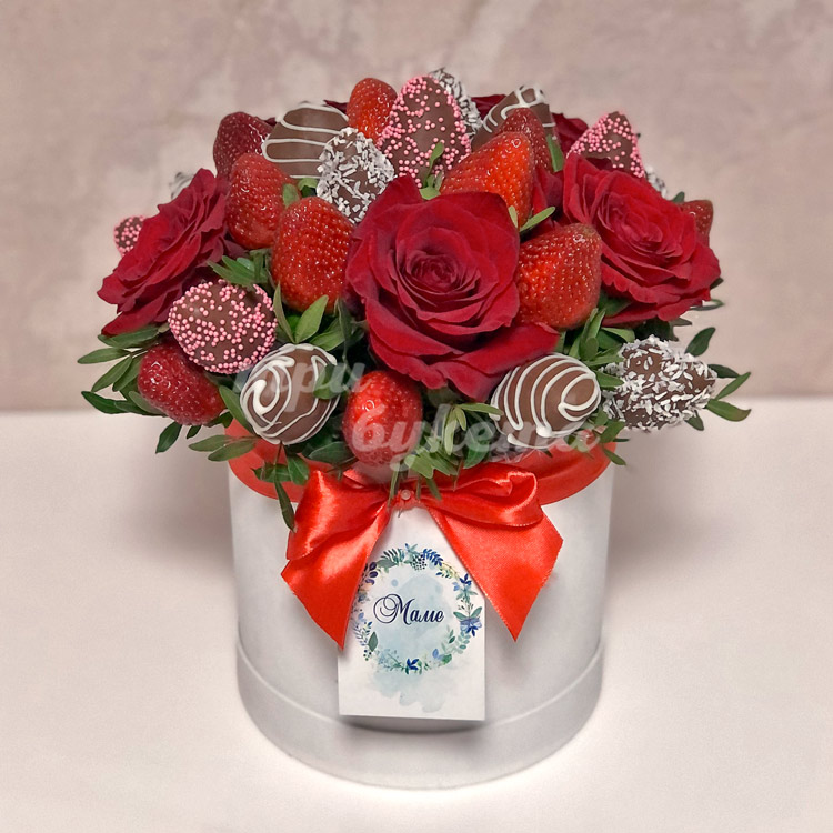 30 ягод клубники и 5 роз в коробке