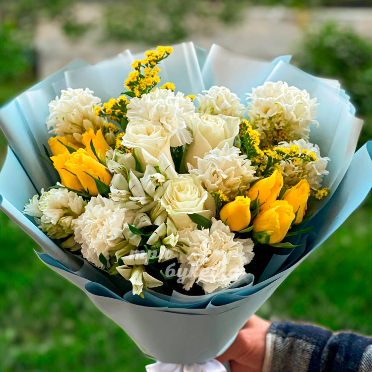 Белые гвоздики и гиацинты с желтыми розами