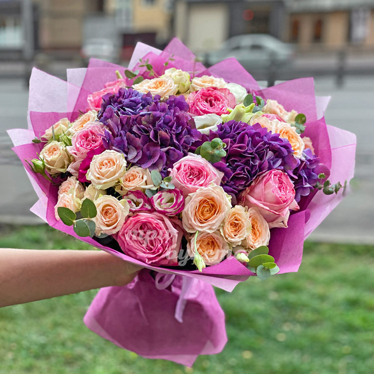 Букет фиолетовых гортензий с розами