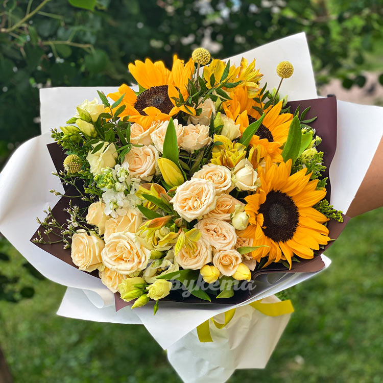 Букет из кустовых роз и подсолнухов