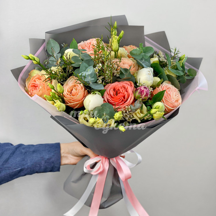 Букет пионов и персиковых пионовидных роз