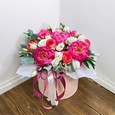 Коробка розовых гортензий и белых орхидей