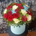 Шляпная коробка роз, эустом и гортензии