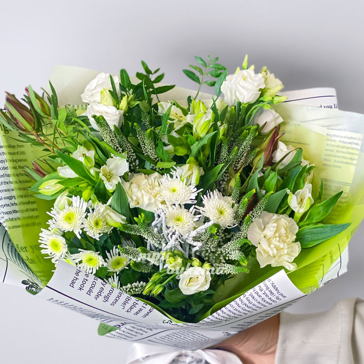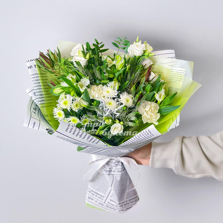 Зеленый букет из хризантем и альстромерий